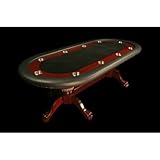 For the sophisticated player, or the player trying to convince the wife to put a poker table in the living room, our Rockwell design table sets the standard in elegance with an optional dining top option. Subtle accents incorporated in the Rockwell's design make for a great living room show piece or dining room gem.The Rockwell features our premium wood work with our hand carved ball and claw leg design and stylish middle board foot rest. Solid wood design and state of the art paint and sealer give the table an unmatched gloss finish. All our high end tables have 5 coats of premium stain, with a final coat of clear gloss sealer for the highest quality paint finish on the market.Ten stainless steel extra large 4in cup holders mounted in the racetrack offers structured seating for all players, and a removable playing surface ensures that you can upgrade, customize or replace the playing surface should the need arise.All Rockwell tables come with a free backup playing surface with your choice of Red, Green, or Blue, please specify the color upon checkout.The optional dining table top can be purchased separately, or as a discounted combo if purchased simultaneously.All Rockwell poker tables ship free and feature our industry best 120 day warranty.